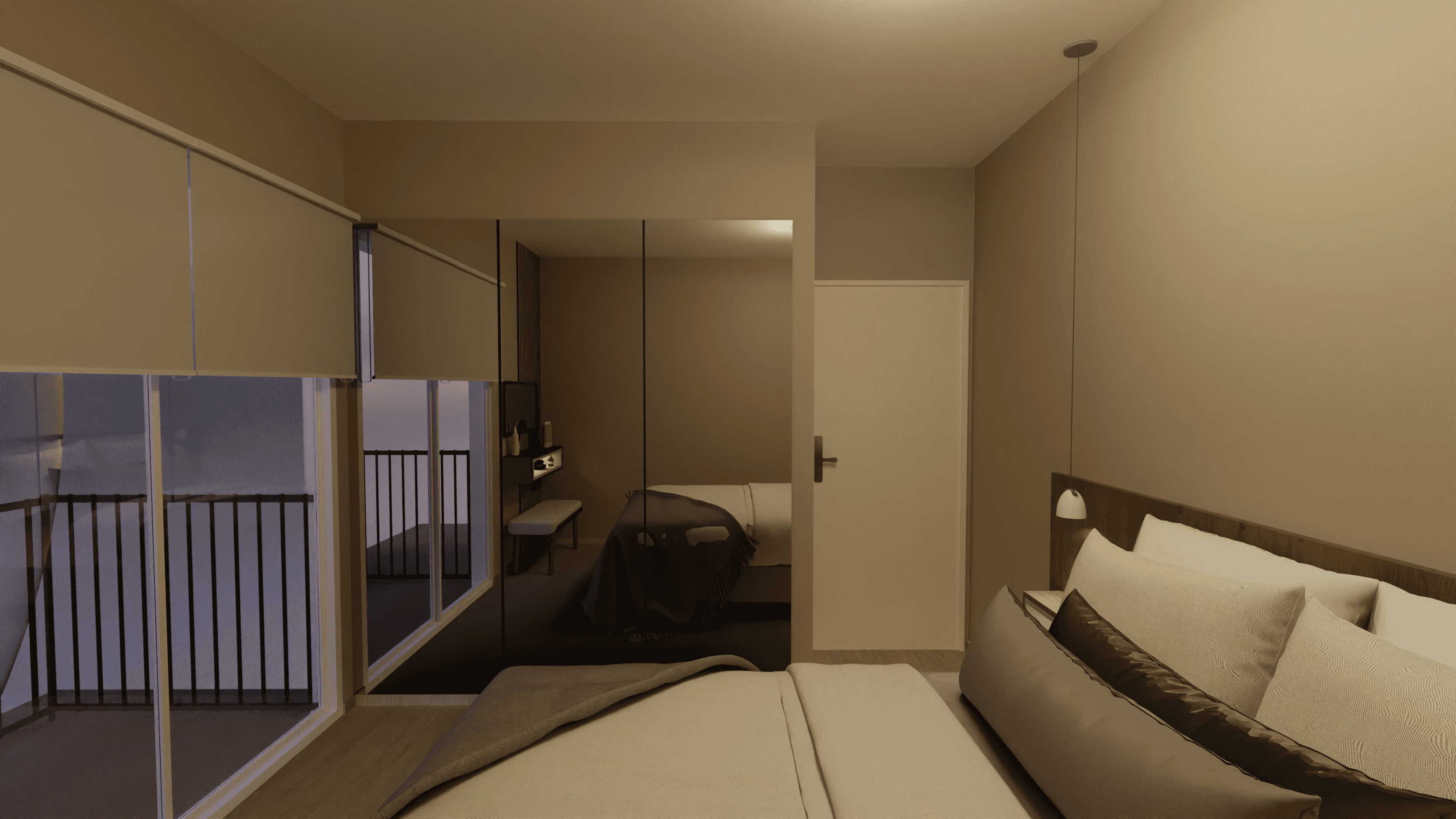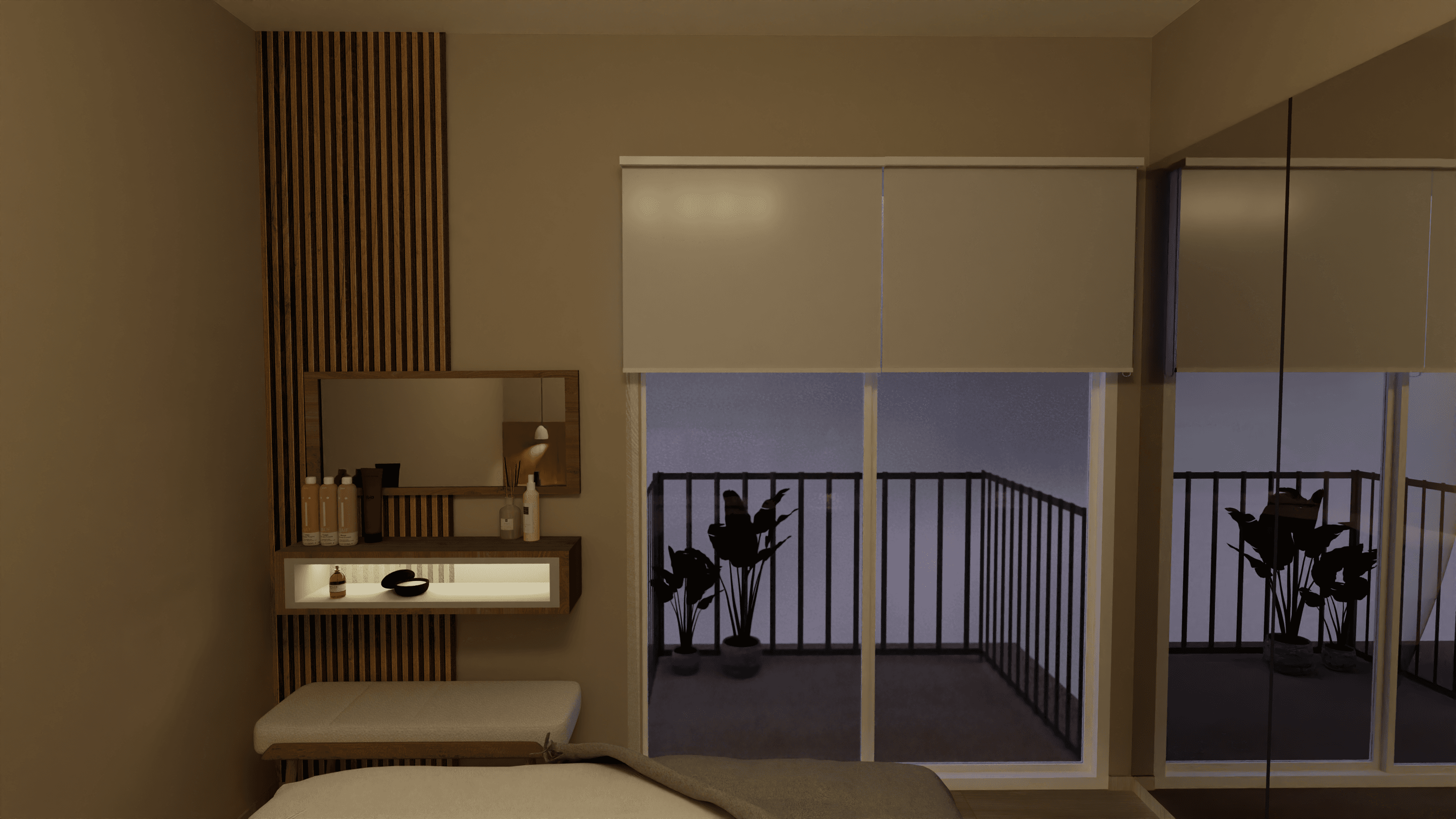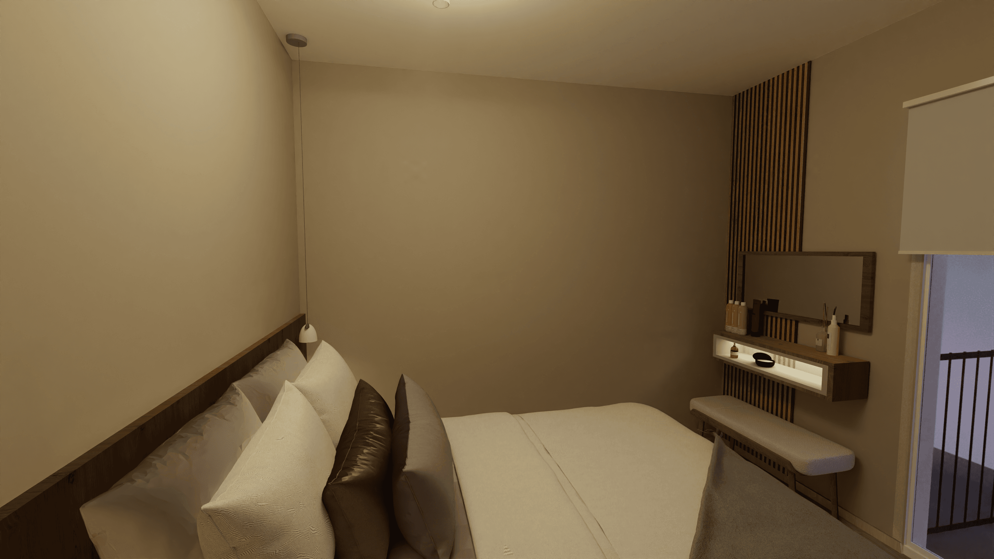 Un espacio íntimo y sereno donde la calidez de la madera, la iluminación tenue y una paleta neutra se combinan para crear una atmósfera de descanso y equilibrio. El diseño prioriza la simplicidad, el orden visual y el confort, integrando detalles funcionales que acompañan la vida cotidiana sin perder elegancia.